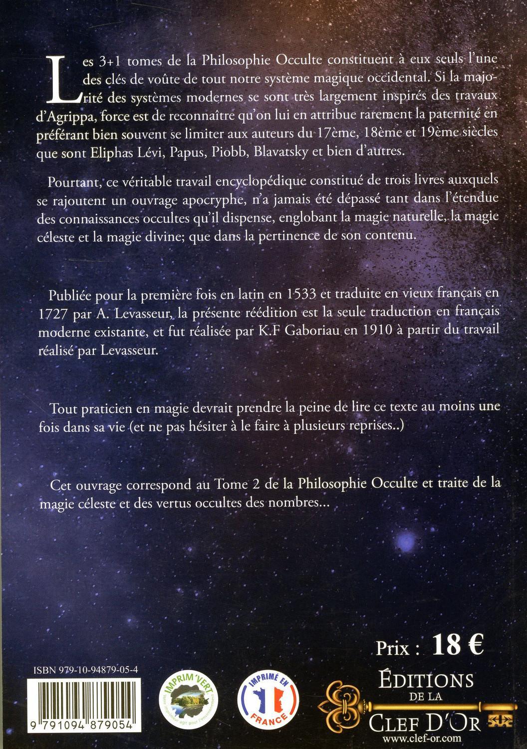 Les 3+1 tomes de la Philosophie Occulte constituent à eux seuls l'une des clés de voûte de tout notre système magique occidental. Si la majorité des systèmes modernes se sont très largement inspirés des travaux d'Agrippa, force est de reconnaître qu'on lui en attribue rarement la paternité en préférant bien souvent se limiter aux auteurs du 17ème, 18ème et 19ème siècles que sont Eliphas Lévi, Papus, Piobb, Blavatsky et bien d'autres. Pourtant, ce véritable travail encyclopédique constitué de trois livres auxquels se rajoutent un ouvrage apocryphe, n'a jamais été dépassé tant dans l'étendue des connaissances occultes qu'il dispense, englobant la magie naturelle, la magie céleste et la magie divine; que dans la pertinence de son contenu. Publiée pour la première fois en latin en 1533 et traduite en vieux français en 1727 par A. Levasseur, la présente réédition est la seule traduction en français moderne existante, et fut réalisée par K.F Gaboriau en 1910 à partir du travail réalisé par Levasseur. Tout praticien en magie devrait prendre la peine de lire ce texte au moins une fois dans sa vie (et ne pas hésiter à le faire à plusieurs reprises..) Cet ouvrage correspond au Tome 2 de la Philosophie Occulte et traite de la magie céleste et des vertus occultes des nombres...