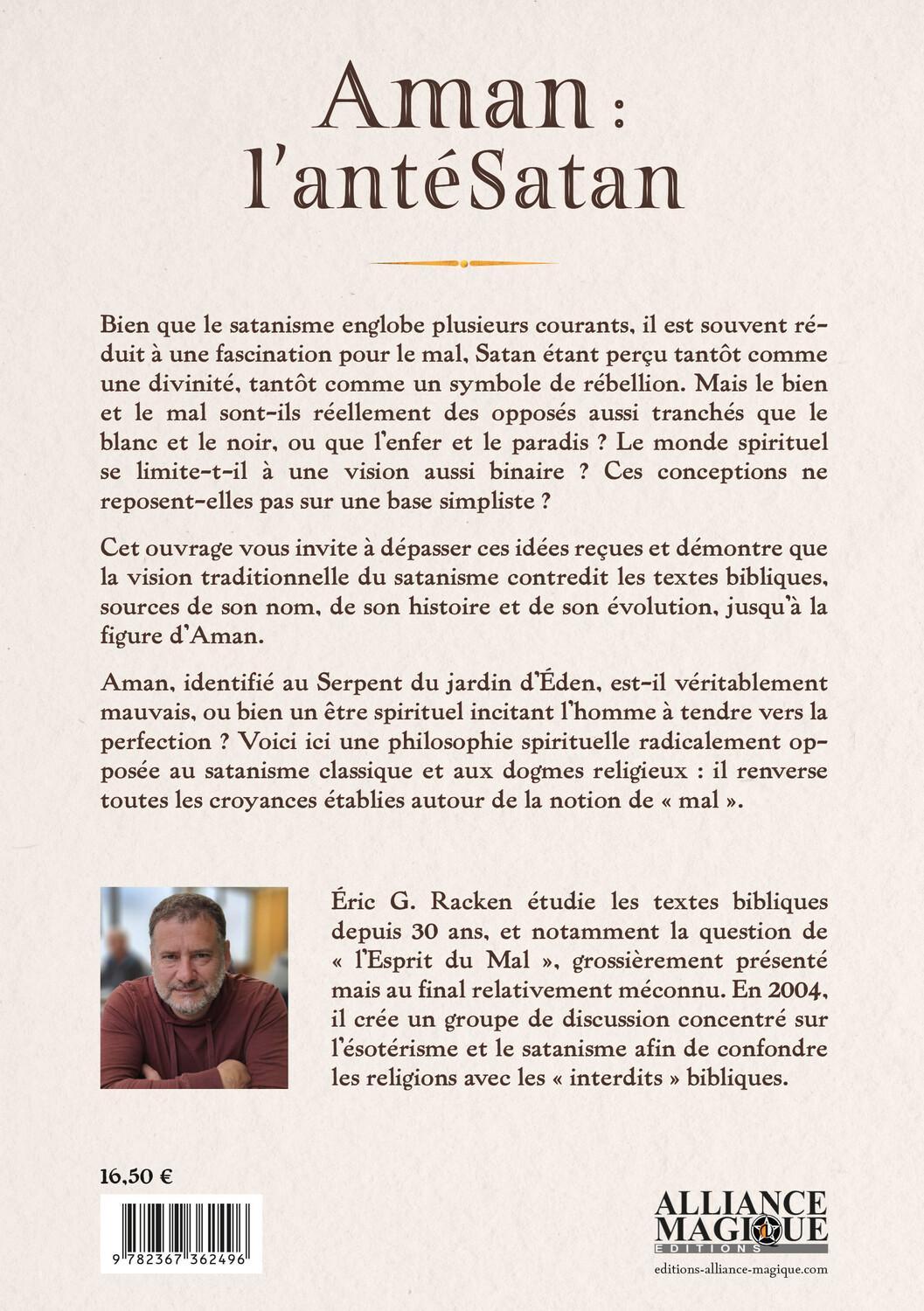 Bien que le satanisme englobe plusieurs courants, il est souvent réduit à une fascination pour le mal, Satan étant perçu tantôt comme une divinité, tantôt comme un symbole de rébellion. Mais le bien et le mal sont-ils réellement des opposés aussi tranchés que le blanc et le noir, ou que l’enfer et le paradis ? Le monde spirituel se limite-t-il à une vision aussi binaire ? Ces conceptions ne reposent-elles pas sur une base simpliste ? Cet ouvrage vous invite à dépasser ces idées reçues et démontre que la vision traditionnelle du satanisme contredit les textes bibliques, sources de son nom, de son histoire et de son évolution, jusqu’à la figure d’Aman. Aman, identifié au Serpent du jardin d’Éden, est-il véritablement mauvais, ou bien un être spirituel incitant l’homme à tendre vers la perfection ? Voici ici une philosophie spirituelle radicalement opposée au satanisme classique et aux dogmes religieux : il renverse toutes les croyances établies autour de la notion de « mal ».
